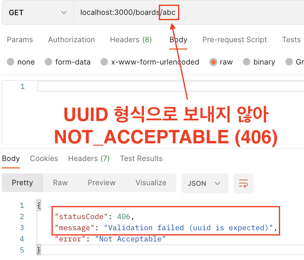 id를 UUID 형식으로 요청보내지 않으면 406 에러를 반환하게 설정했다.
