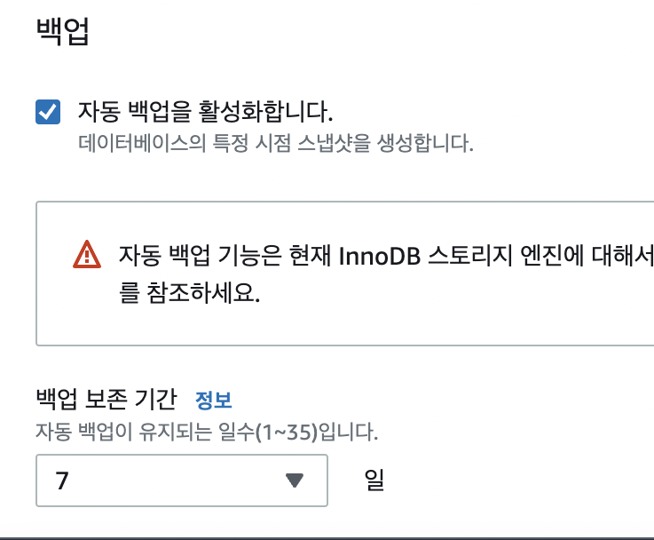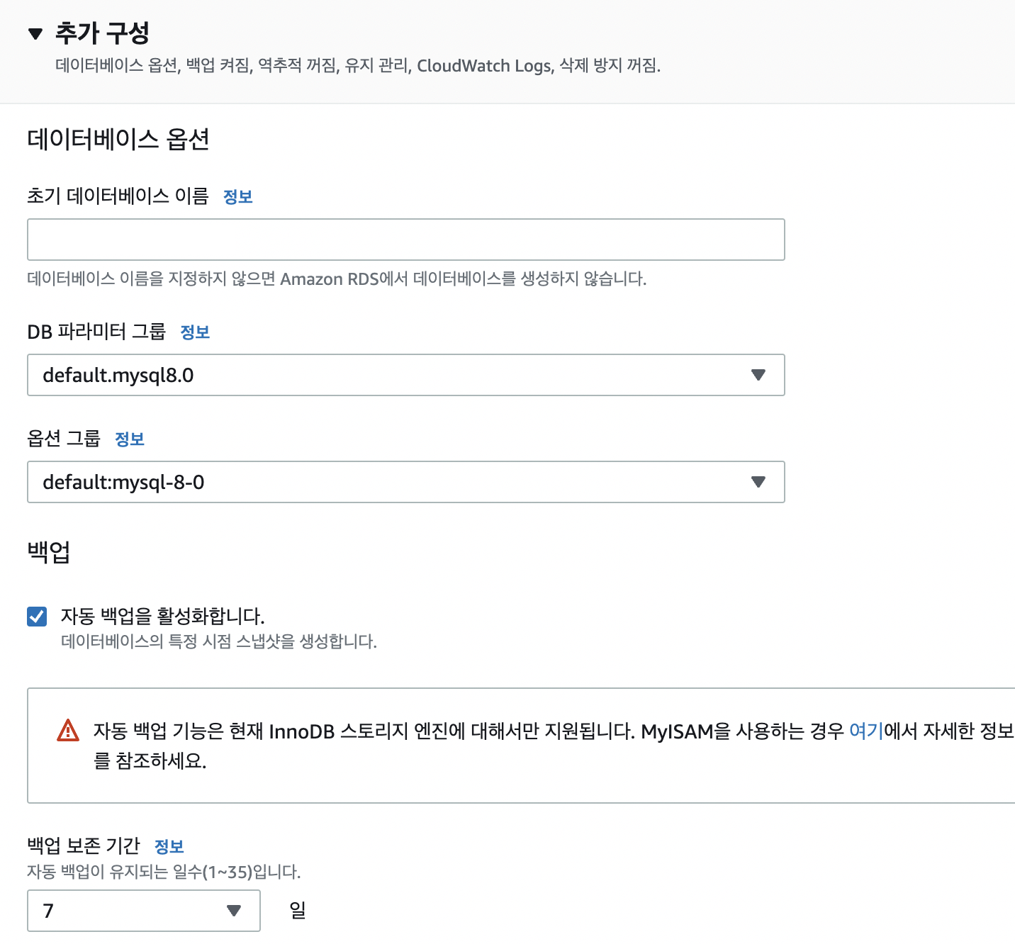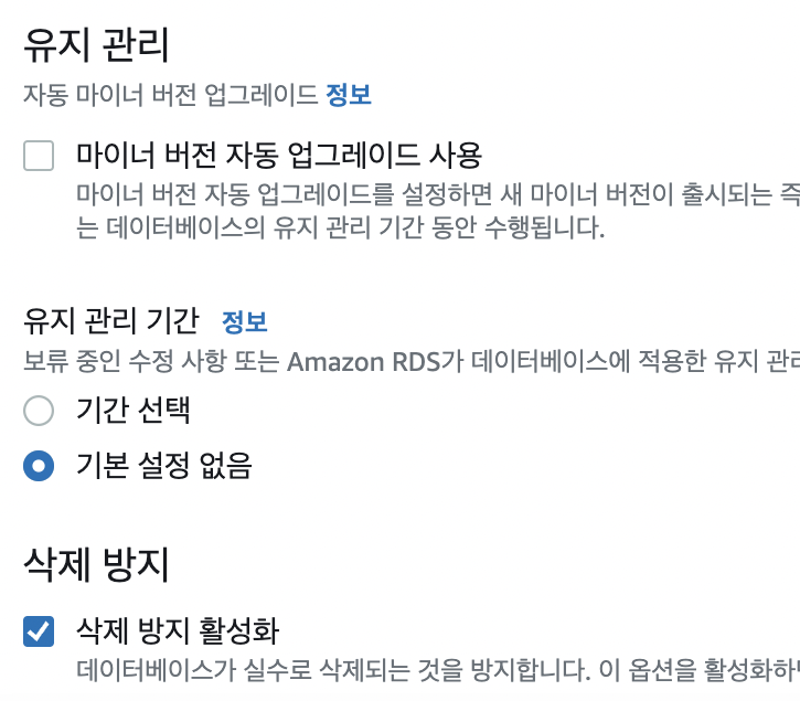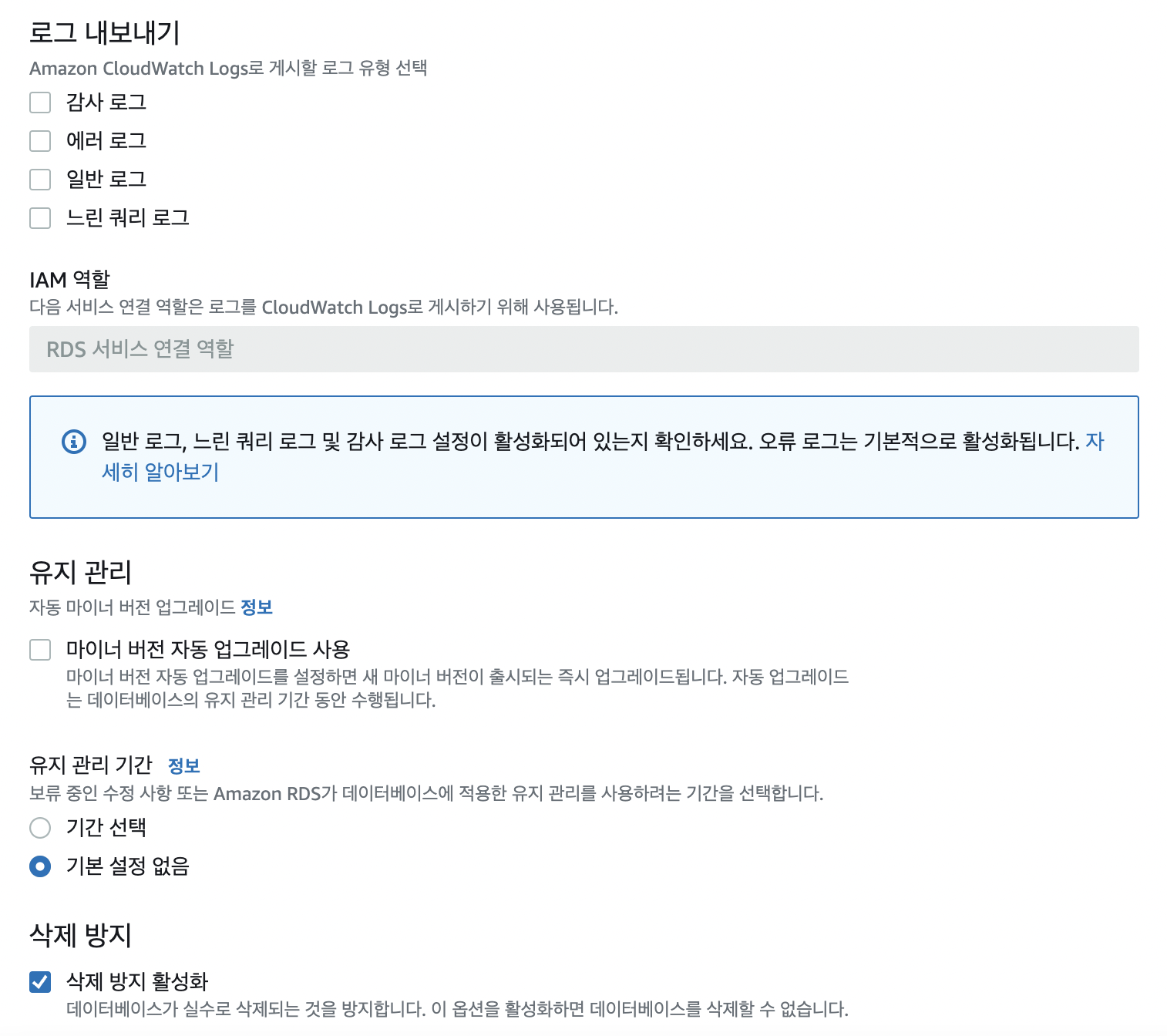 RDS 데이터베이스를 생성할 때 백업, 로그 관리, 유지 관리 및 버전 업그레이드 사용 유무를 설정할 수 있다.