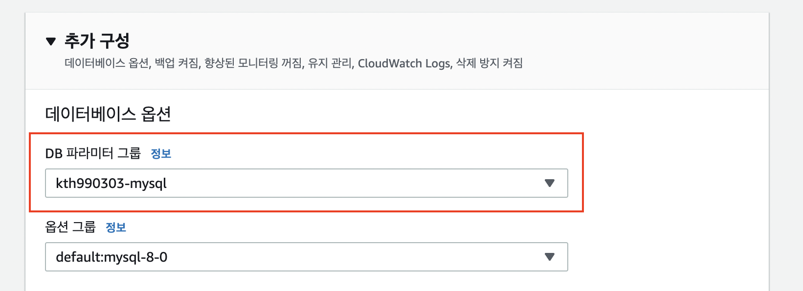 데이터베이스 수정을 클릭하여 밑으로 쭉 내리면 `추가 구성`에 DB 파라미터 그룹을 설정하는 부분이 있다.