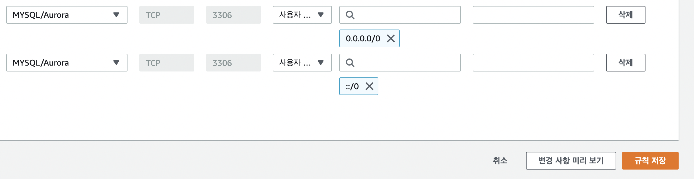 어디에서든 DB에 접속할 수 있도록 0.0.0.0/0 으로 세팅해주었다.