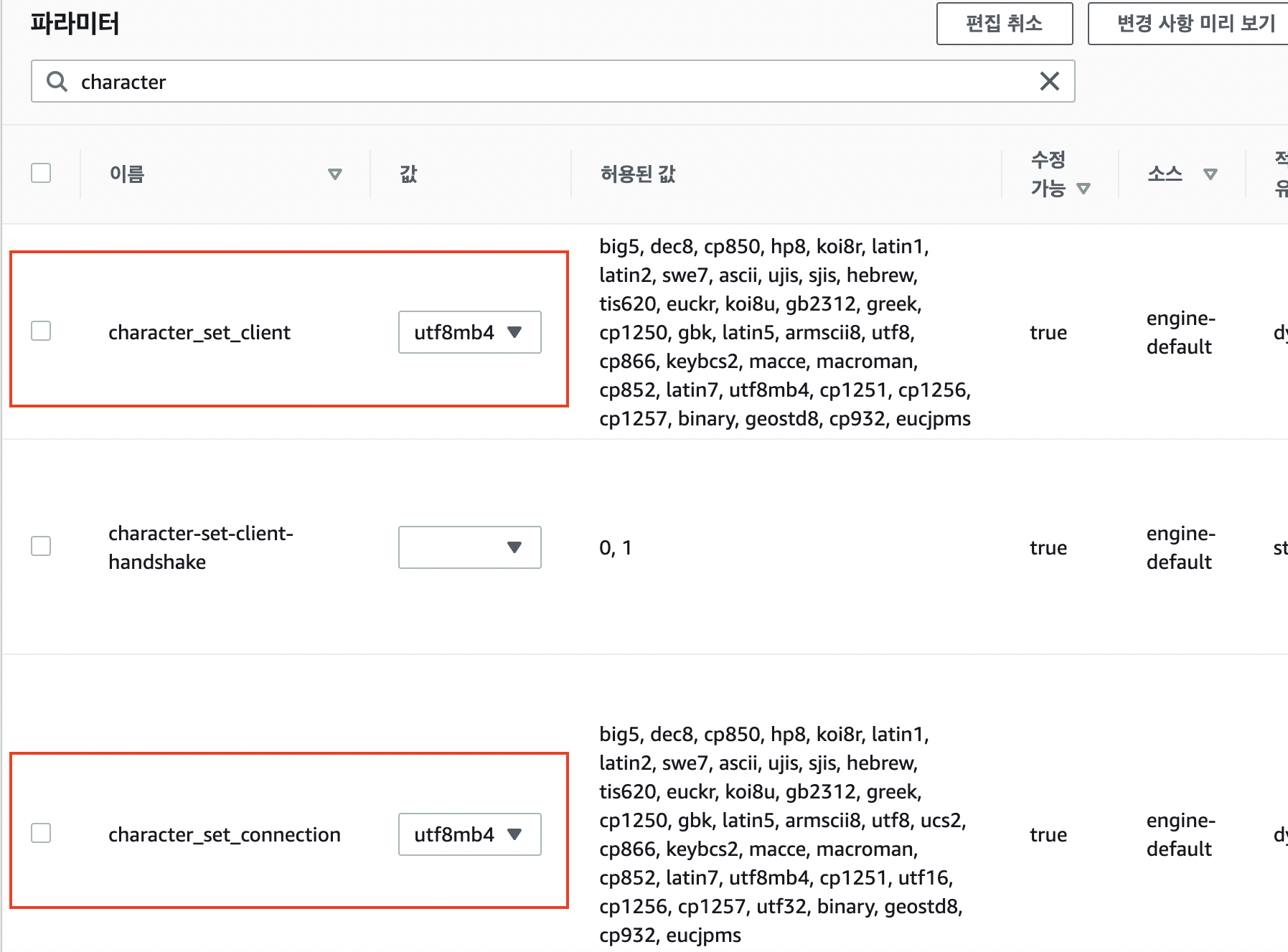 아래 파라미터 정보들을 utf8mb4로 세팅해주자.