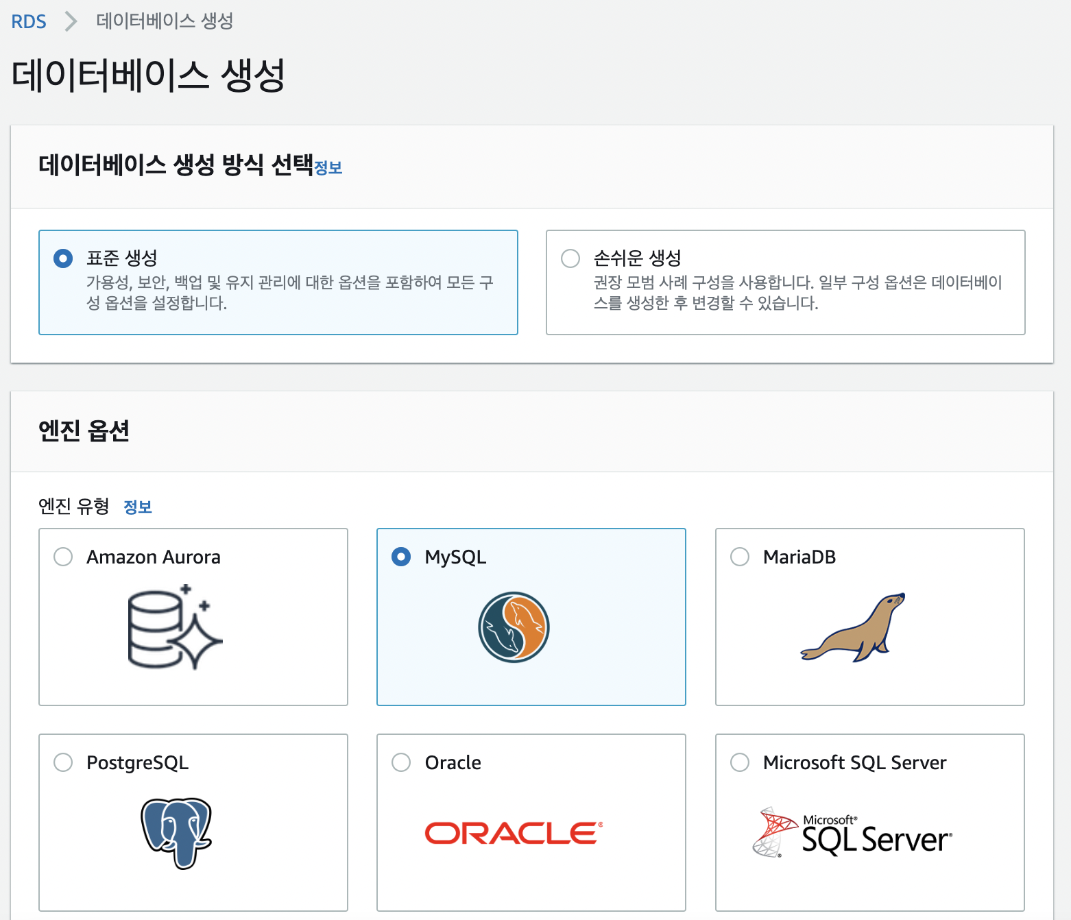 RDS 프리티어를 사용하기 위해서는 손쉬운 생성 대신 표준 생성을 눌러주어야 한다.