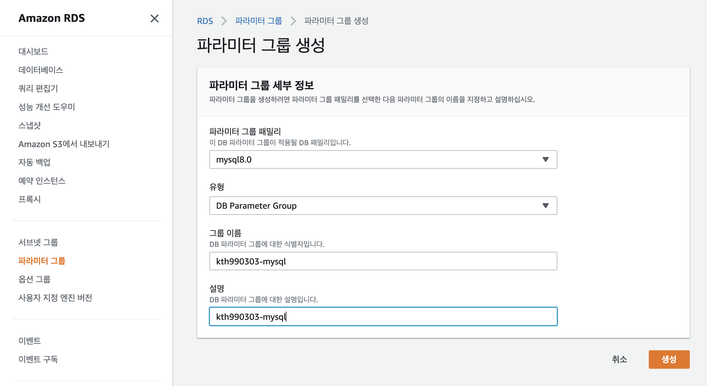 왼쪽 메뉴에서 `파라미터 그룹`을 클릭해준 후, 파라미터 그룹을 생성해주자.