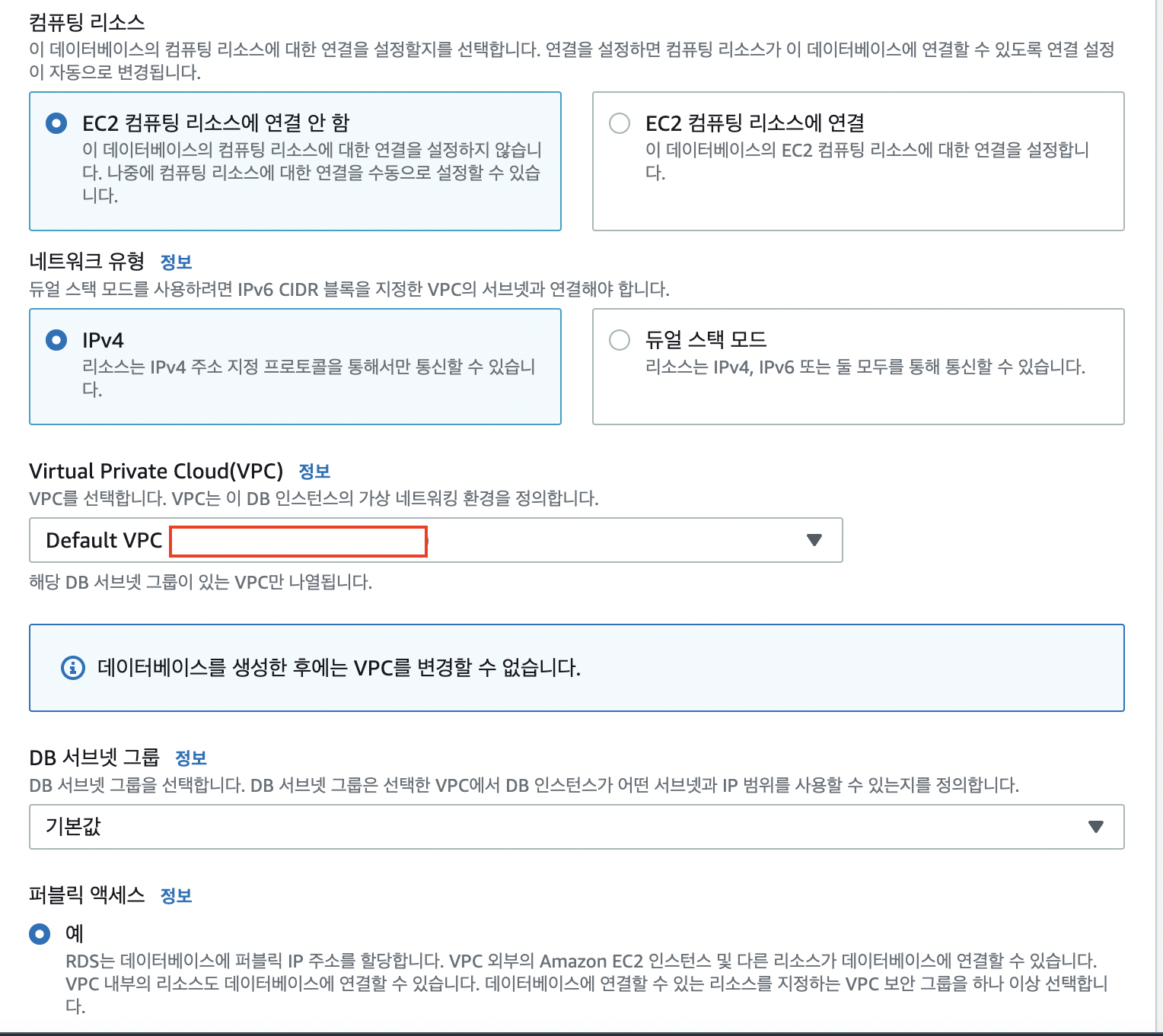ec2 인스턴스 역시 로컬이 아닌 별도의 서버이기 때문에 서버 ec2에서 RDS에 접속하려면 퍼블릭 엑세스를 허용해주어야 한다.