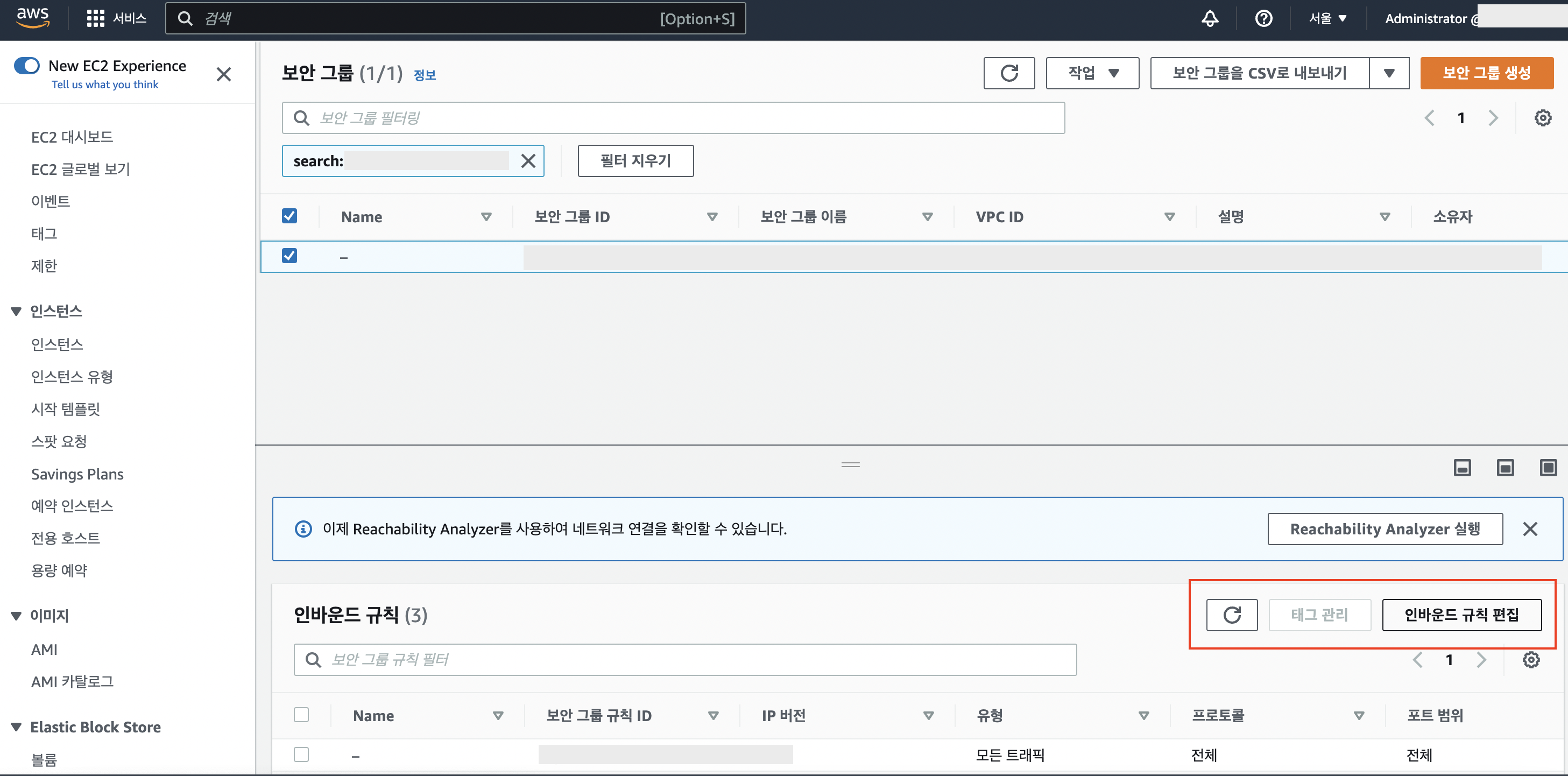 여기서 우측 하단에 보이는 인바운드 규칙 편집을 클릭해주자.