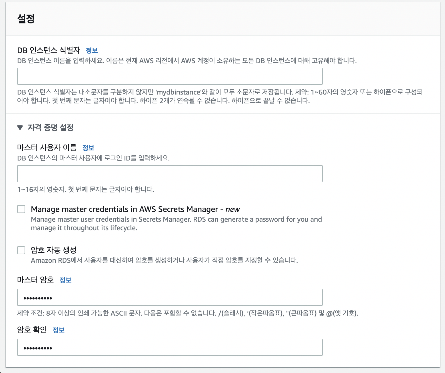 DB 인스턴스명은 자신이 식별할 수 있도록 알아서 잘 작성해주면 된다.