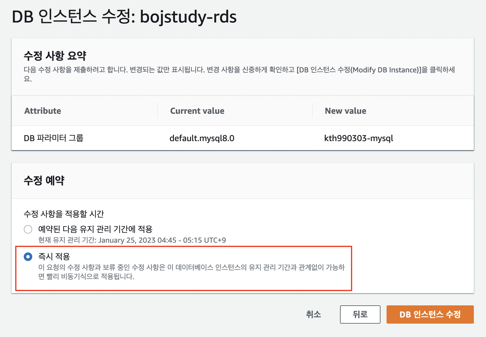 즉시 적용을 눌러주어 DB 인스턴스를 수정하자.