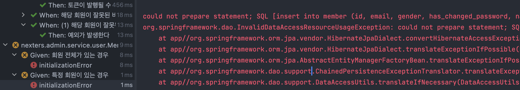 org.springframework.dao.InvalidDataAccessResourceUsageException: could not prepare statement; SQL [insert into member (id, email, gender, has_changed_password, name, value, phone_number, status) values (default, ?, ?, ?, ?, ?, ?, ?)]; nested exception is org.hibernate.exception.SQLGrammarException: could not prepare statement