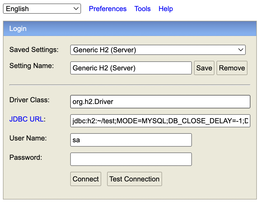 Connect를 누르면 연결이 돼야 정상이다. (만약 안된다면 yml 설정파일 오류를 의심해보거나, test.mv.db 파일 문제이니 터미널 홈으로 들어가서 test.mv.db를 지워주고 다시 해보자.)