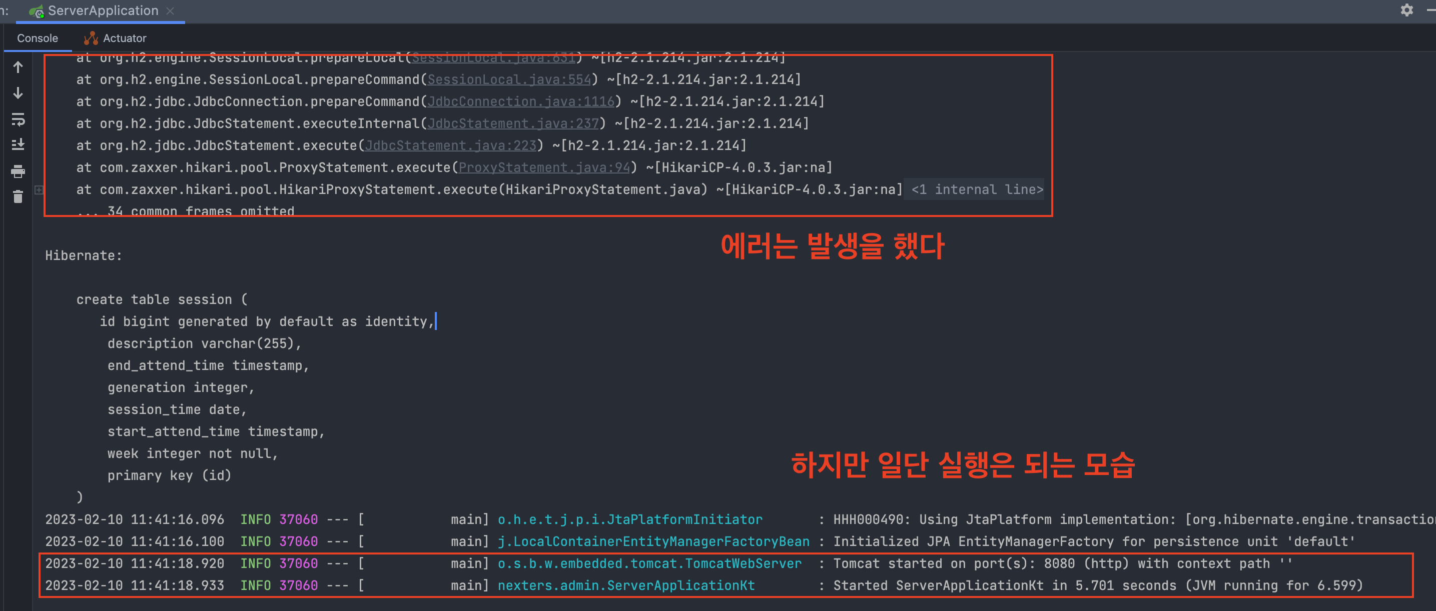 정말 신기하게도 현재 이 포스팅에서 다루는 에러는, 애플리케이션 자체는 실행이 잘 되는 모습이다.