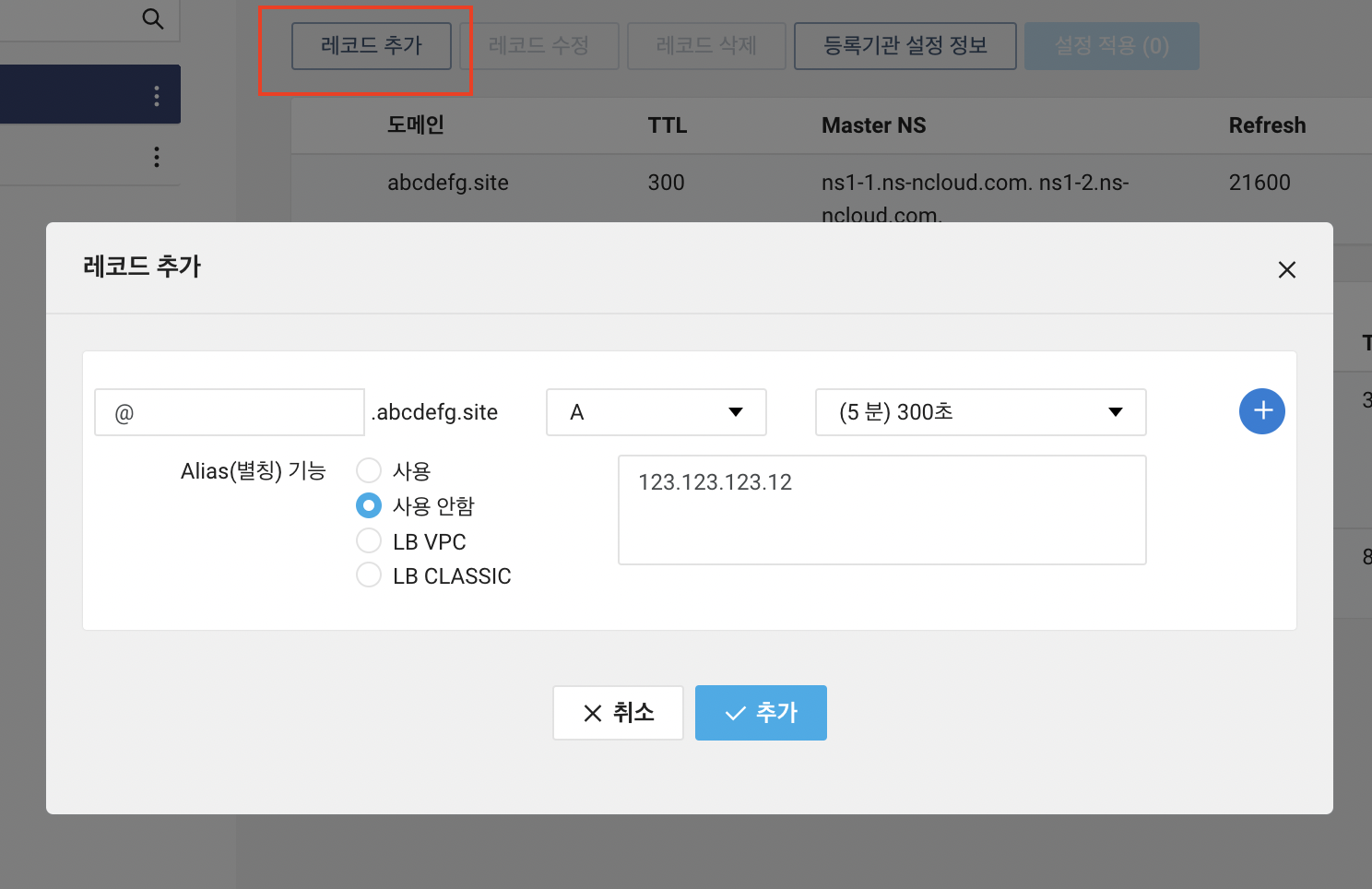 레코드 추가를 눌러서 위와 같이 루트도메인 (abcdefg.site)으로 접속 시 해당 서버의 퍼블릭 ip로 연결될 수 있도록 지정해준다.