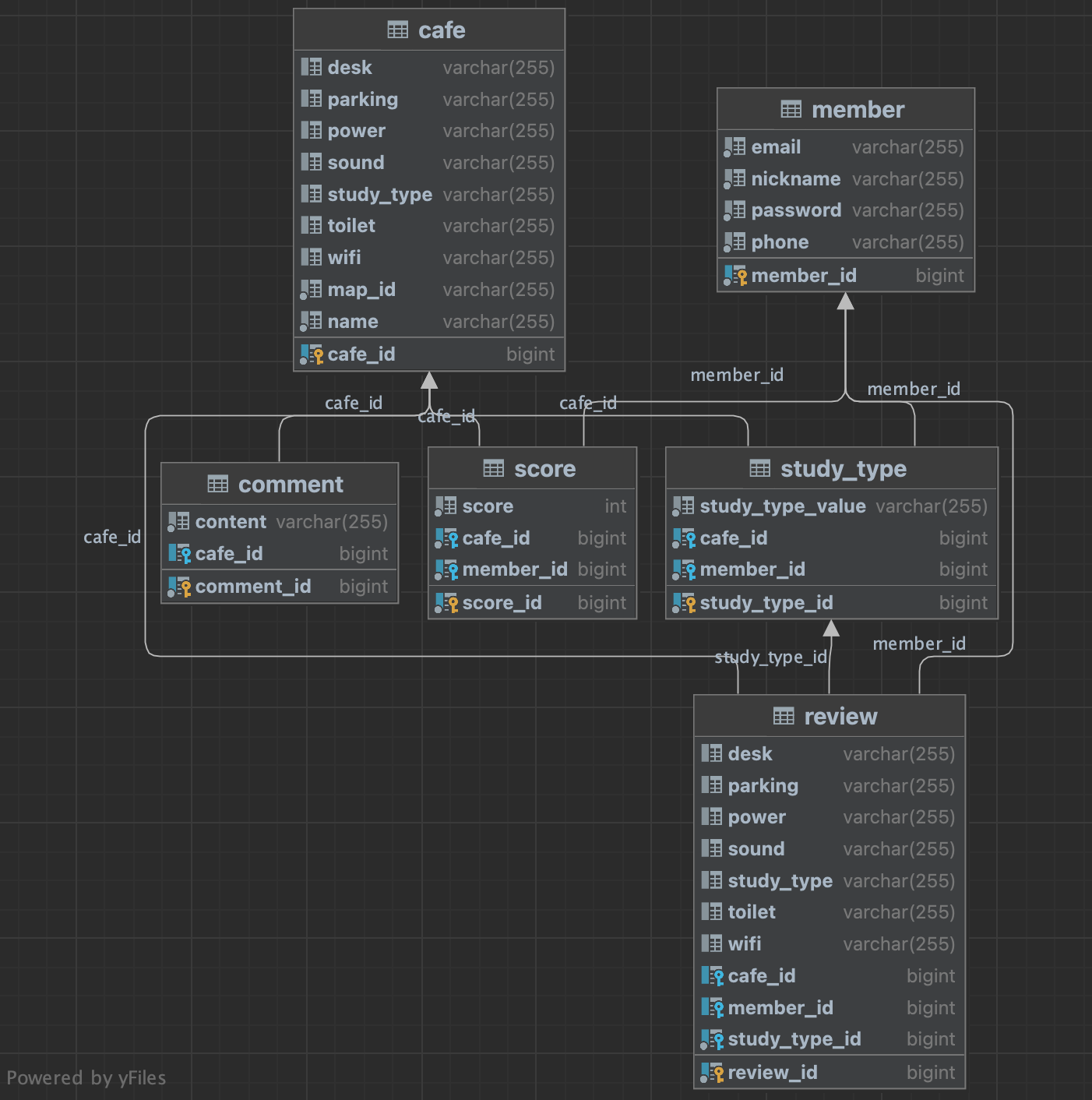 리뷰에는 평점, 해당 카페에 대한 스터디 타입(혼코딩하기 좋은지, 팀플하기 좋은지), 세부정보(와이파이, 콘센트 등)에 대한 내용을 작성할 수 있습니다. 특정 카페에 대한 리뷰는 한 사람이 여러 개를 달 수 없습니다. 리뷰가 작성될 때마다 카페에서는 해당 리뷰를 반영한 정보로 업데이트해주어야 합니다.
