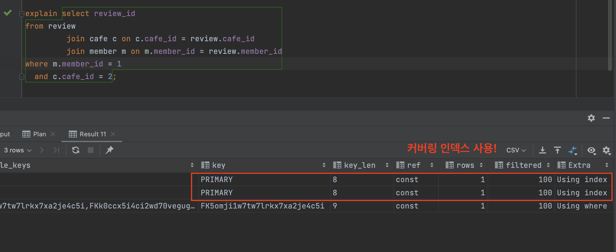 데이터 수가 많지 않아서 cost를 비교하기보단, Extra를 확인하는 것에 집중했습니다. Extra를 잘 보시면 Using index라는 결과가 출력되었습니다. 이는 커버링 인덱스를 타서 더 빠른 속도로 쿼리 결과를 반환했다는 뜻에 해당됩니다!