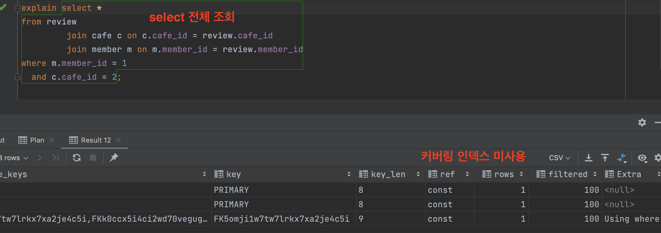 그렇기 때문에 review.id만 조회하도록 아래와 같이 쿼리를 개선했습니다. 위에서와 마찬가지로 불필요한 쿼리 조회 결과의 컬럼 개수를 줄이기 위해서입니다.