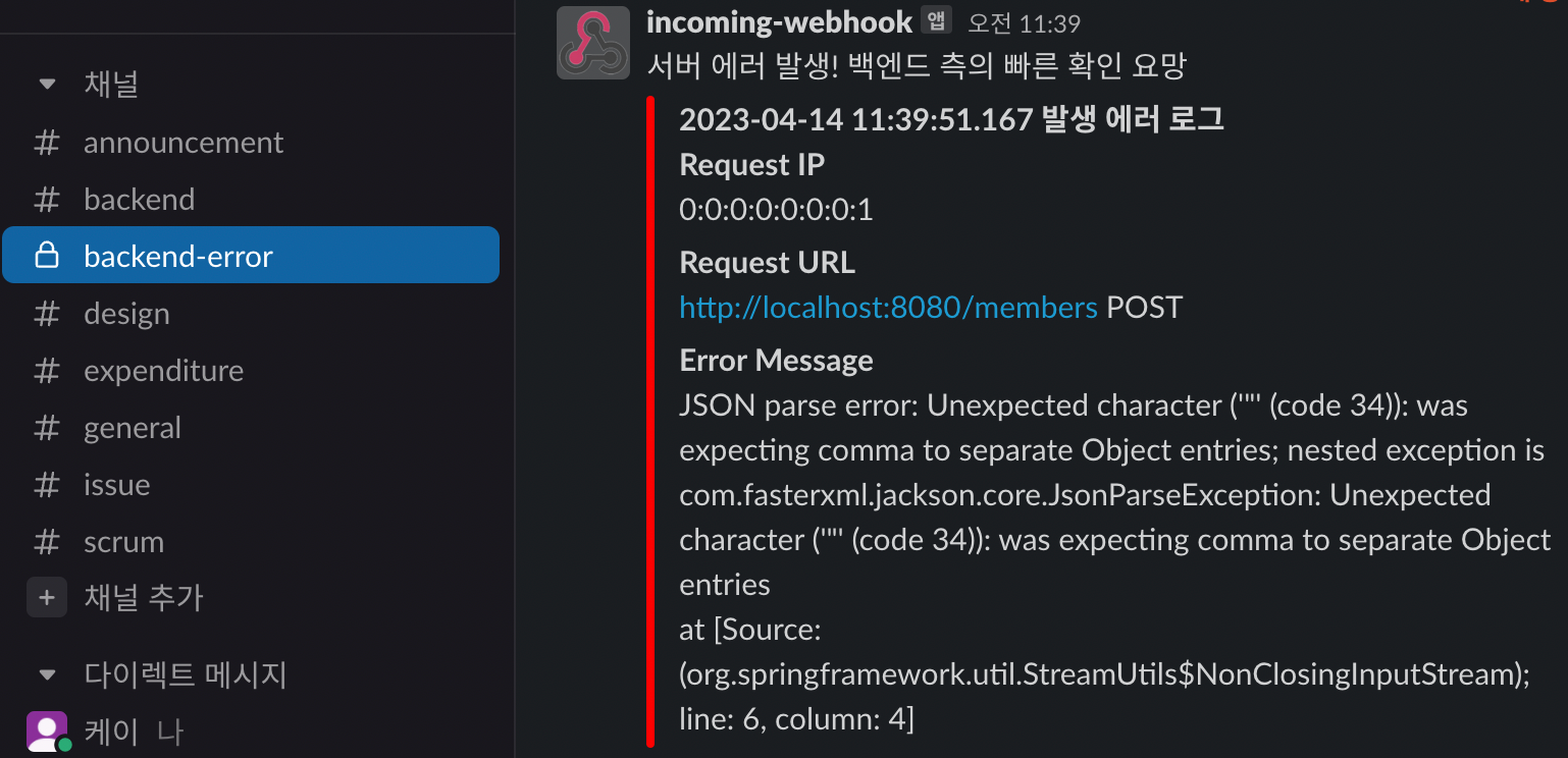 위 두 가지의 단점이 크게 느껴져서 internal server error 발생 시에 슬랙으로 알림을 보내주도록 설정했습니다.