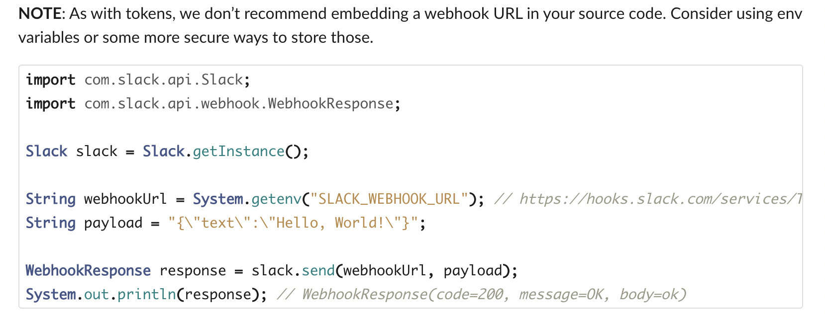 Slack SDK for Java 홈페이지(https://slack.dev/java-slack-sdk/guides/web-api-basics)의 예시 코드를 살펴보자면 아래와 같습니다.