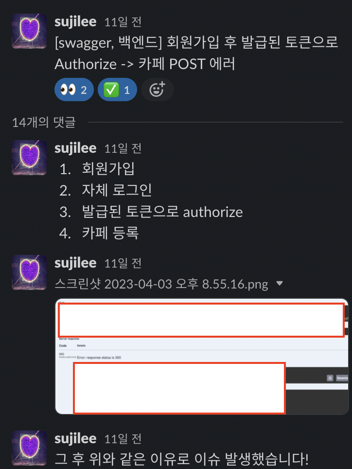 - (다른 파트에서 먼저 발견한 경우) 백엔드 측 에러임에도 불구하고, 백엔드 팀원은 비교적 뒤늦게 확인