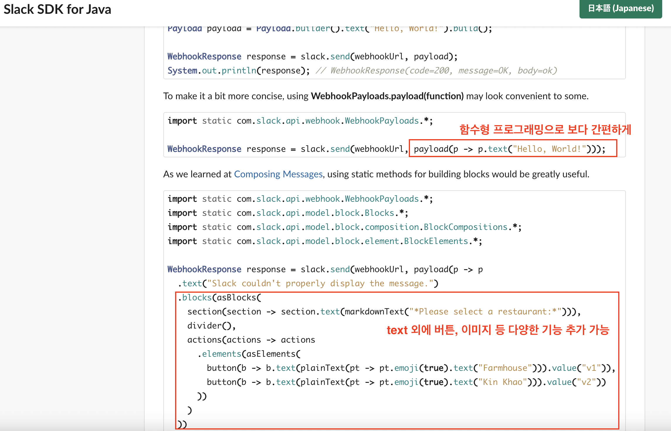 Payload.builder() 또는 직접 json 형태로 텍스트를 작성하여 payload를 만든 후, slack.send(webhookUrl, payload) 로 보내줄 수도 있습니다. 하지만, Java8의 함수형 프로그래밍을 이용한다면 더 간편하게 이용이 가능합니다.