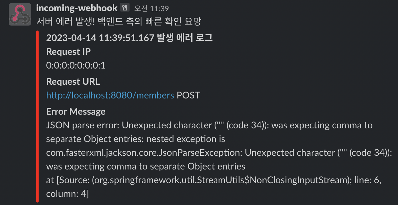 하지만 단순히 text만 담아서 보내주는 것은 가독성이 그리 좋지 않다고 판단했습니다. 단순 Error의 getMessage() 값만 텍스트로 담아서 슬랙에 알림을 보내준 예시 화면은 아래와 같습니다.