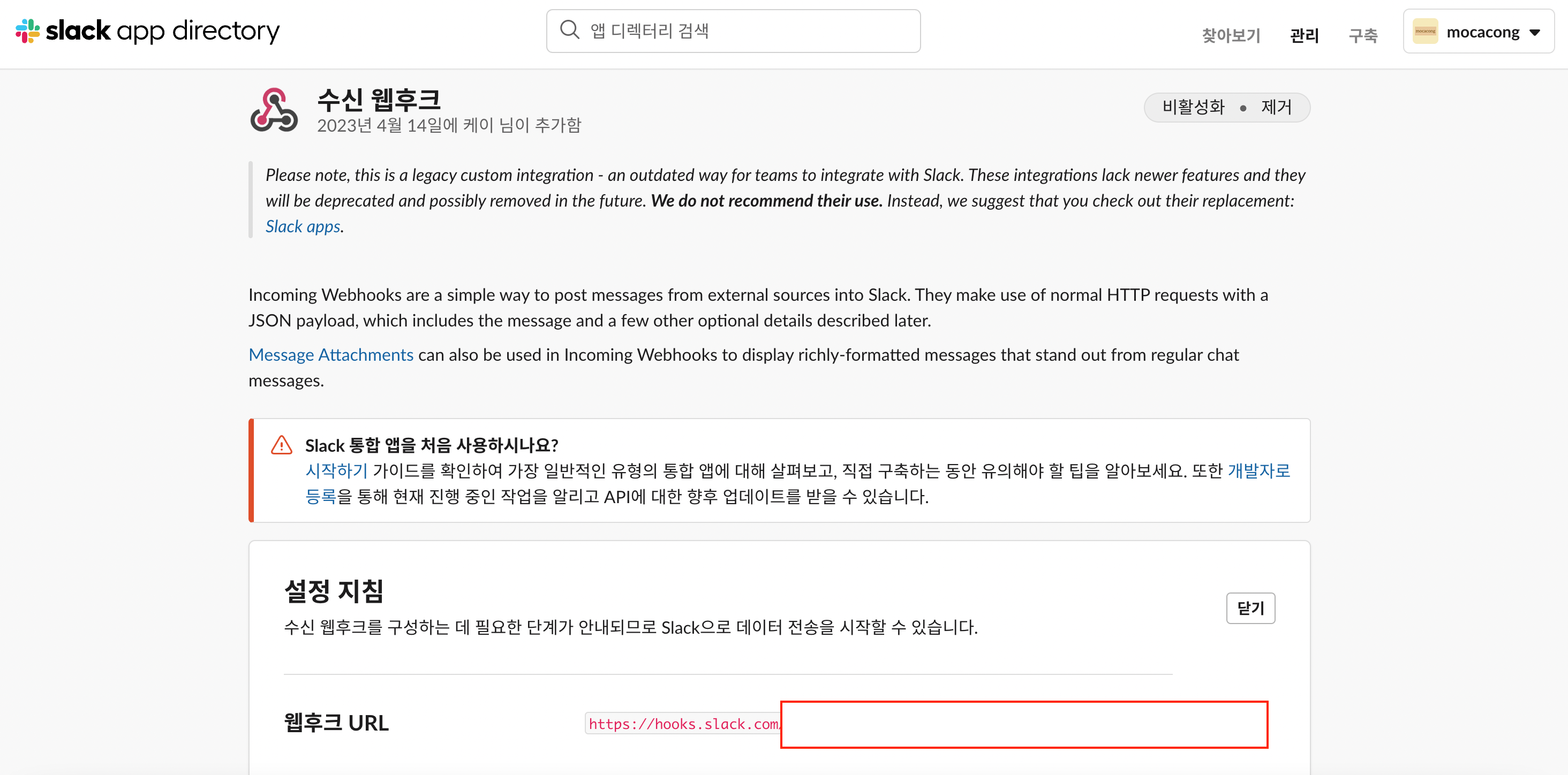 여기서 보이는 웹후크 URL이 스프링 애플리케이션 yml 환경변수로 들어가므로 잘 복사해두도록 합시다.