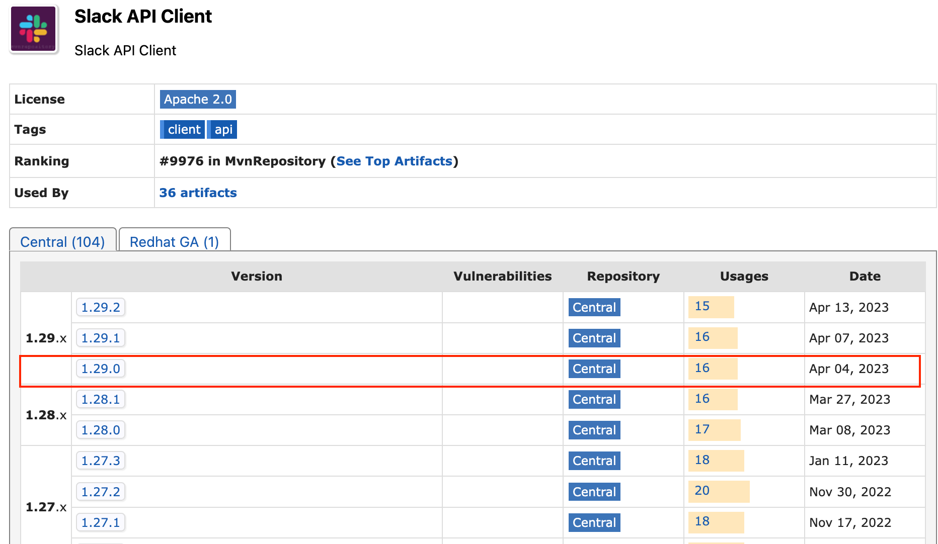 MavenRepository를 참고하여 취약점이 없는 라이브러리이자 최근에도 update가 활발하게 진행되고 있는 라이브러리인 slack-api-client를 선택했습니다. 버전은 1.29.0을 선택했습니다.