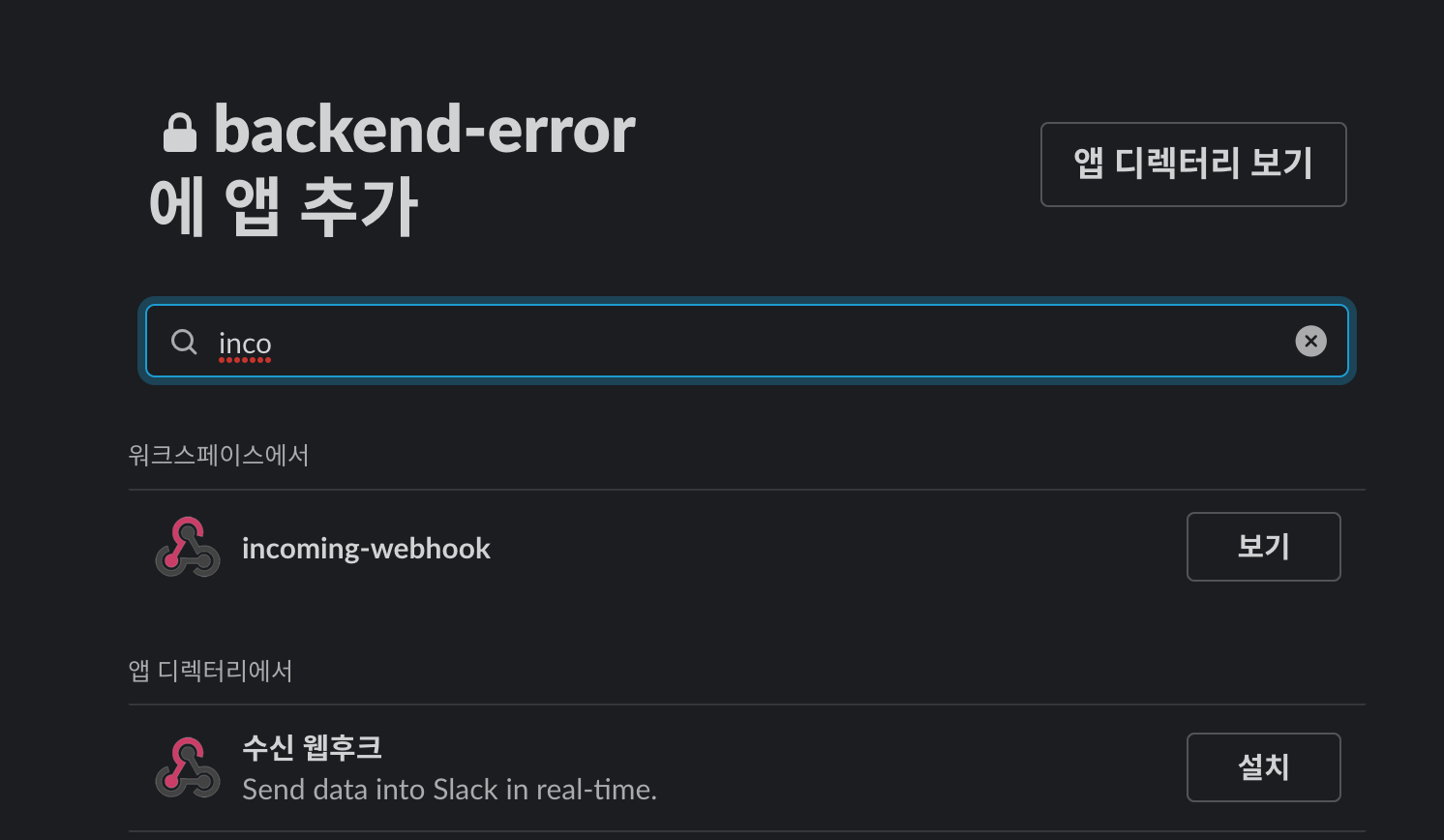 `앱 추가`에서 incoming webhook 을 추가해줍시다.