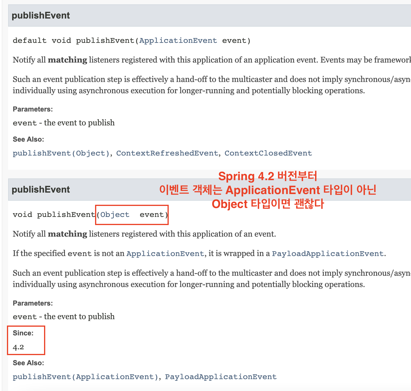 참고로 스프링 4.2버전 부터는 이벤트 객체를 생성할 때 ApplicationEvent를 상속받을 필요가 사라졌다.