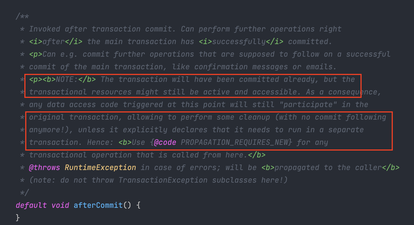 이는 TransactionSynchronization 클래스의 afterCommit 메서드 주석에 안내돼있는 바와 같다.