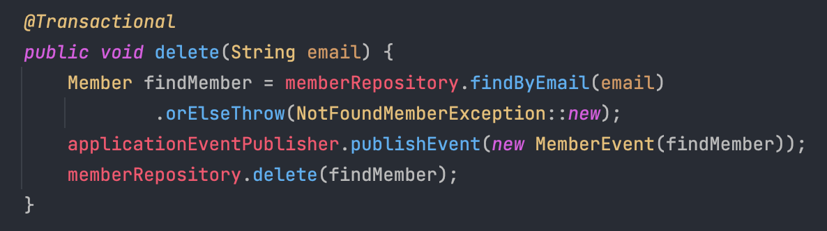 applicationEventPublisher.publishEvent(new MemberEvent(findMember));