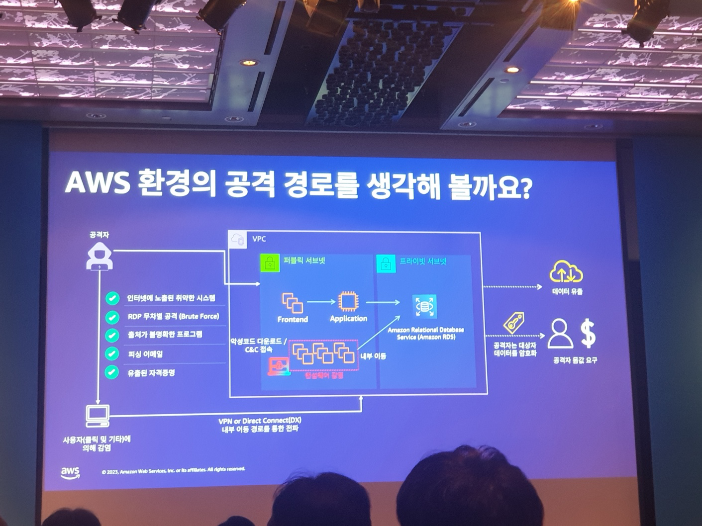 네트워크 쪽 방어에 대해서는 private subnet 및 NACL(네트워크 접근제어 리스트), SG(보안그룹) 세팅 정도만 알고 있었는데, aws에서 제공해주는 Route 53 firewall, AWS WAF(Web Application Firewall) & Shield 기능도 있었다! 그리고 내부 실수 및 공격을 방지하기 위한 AWS Systems Manager, AWS backup 등. 마지막으로 모니터링을 위한 AWS Cloudwatch, AWS Config, AWS GuardDuty. AWS GuardDuty로 악의적 공격을 탐지하고 깊게 파기 위해 AWS Detective를 이용한다고 한다. AWS GuardDuty와 AWS Detective는 우리 사이드 프로젝트에도 있으면 좋겠다 싶어서 세션이 끝나고 이용해보려 했으나... 프리티어가 아닌 유료 범위였다. (30일 동안은 무료)