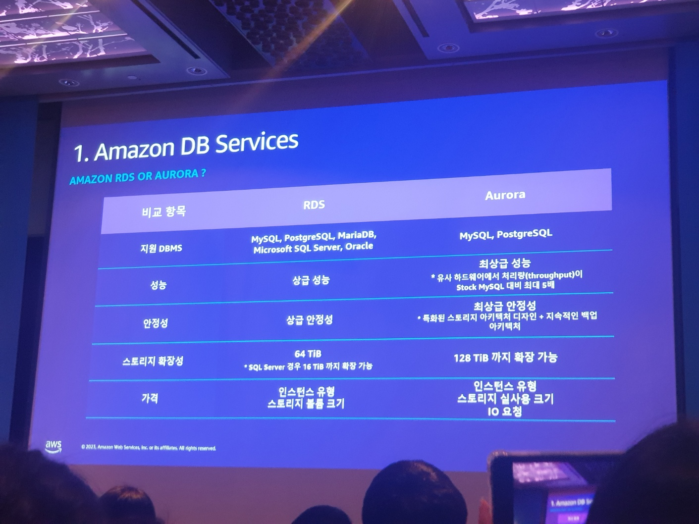 이어서 RDS 마이그레이션 세션도 참가해보았다. 사실 DB 마이그레이션 과정이 궁금해서 참여해보았는데, 뜻하지 않게 그동안 궁금했던 RDS vs Aurora 차이를 알 수 있었다! RDS에 비해 Aurora가 성능 및 안정성이 좋지만, 비용이 비싸고 버전 지원이 적다는 점이다. 내가 참여하고 있는 사이드 프로젝트에서도 Aurora는 프리티어 지원이 안되고 비교적 비싼 것으로 알고 있었기 때문에 RDS를 사용하고 있었다. 역시... 돈이 문제다. 나중에 입사하고 나서 Aurora 마음껏 사용해보든지 해야지.