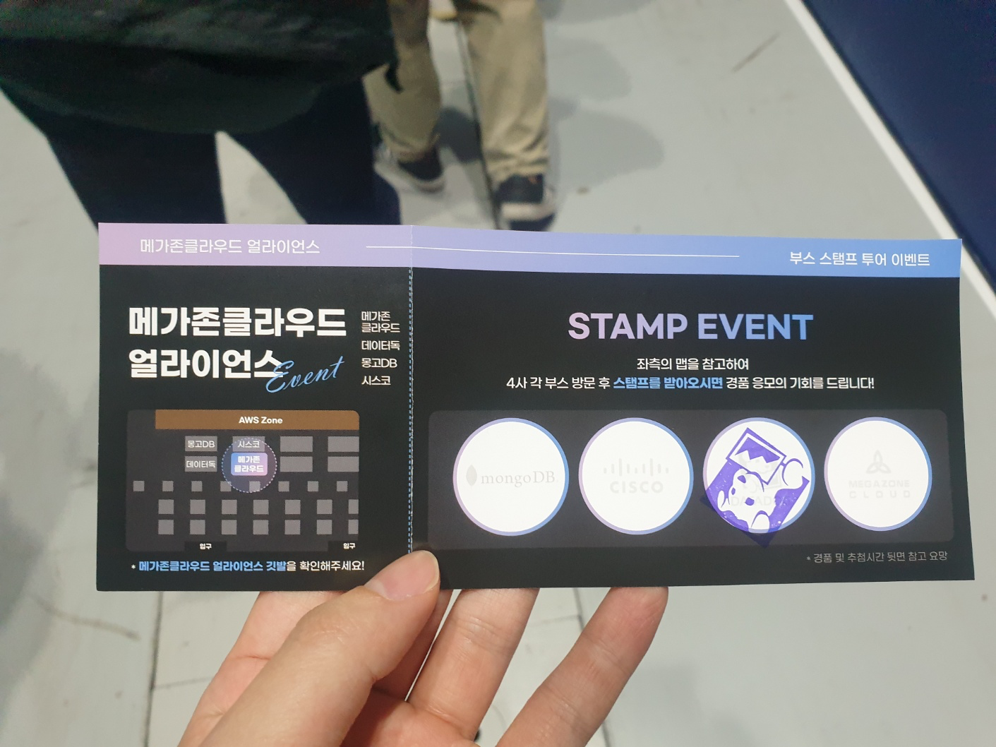 이벤트 응모를 위해서는 MongoDB, CISCO, Datadog, Megazone Cloud 부스의 설문조사를 한 후, 도장을 받아야 했다. 그래서 그런지 해당 부스 줄이 상당히 길었다. 가장 긴 줄은 10분 이상 기다렸던 것으로 기억한다.