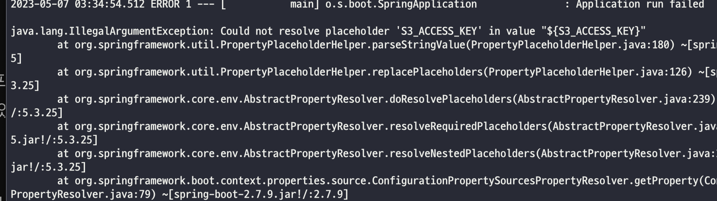 이럴수가, 환경변수를 삽입하지 않았던 것입니다! PROD_YML 환경변수가 있어야 application-prod.yml 이 만들어지는데, PROD_YML 환경변수가 아예 없었던 것이죠.