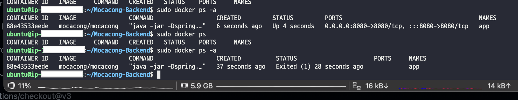 하지만 사실 docker-compose.yml에 문제가 없음은 물론이고, err로 출력된다 하더라도 Creating App은 문제없이 진행된 것이었습니다! 포트에 문제는 없었죠. 아는 지인이 해당 문제 상황을 보고, 컨테이너가 실행됐다가 바로 꺼졌을 확률도 있으니 docker ps -a 명령어로 확인해보라고 조언을 해주었습니다.