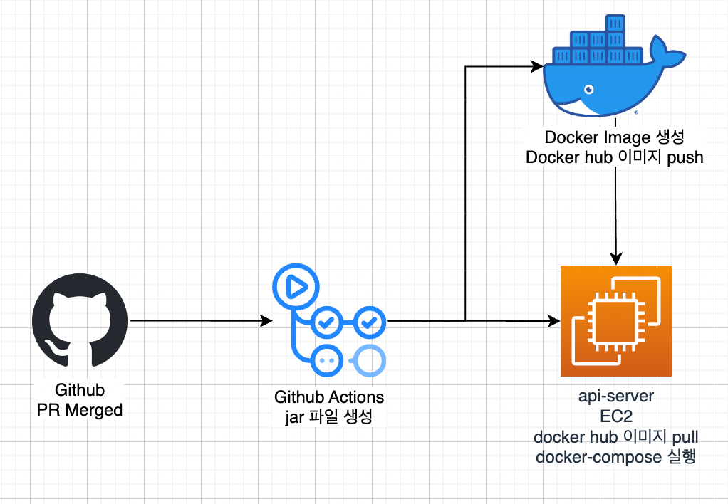 - Github Actions 스크립트로 EC2에 접근하고, push한 도커 이미지를 pull하여 실행합니다.