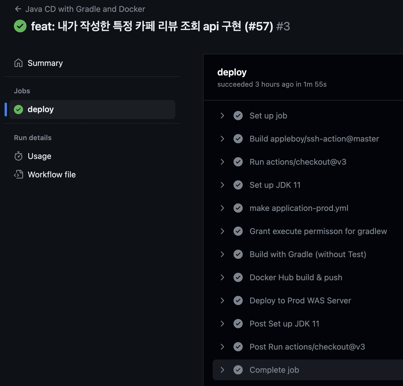 여기서 주의할 점은, Deploy to Prod WAS Server 에서 script를 수행할 때 docker-compose가 있는 환경으로 이동해야된다는 점입니다. 그렇지 않으면 Github Actions CD workflow는 통과하지만, 애플리케이션 배포가 제대로 되지 않을 수 있습니다.