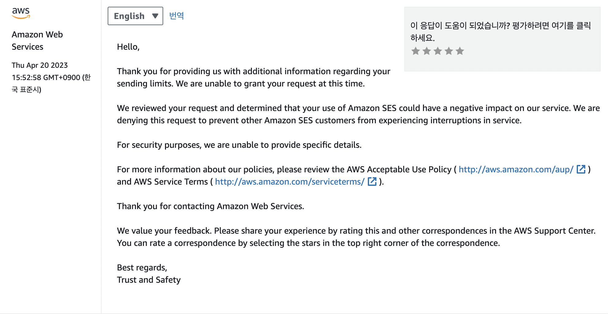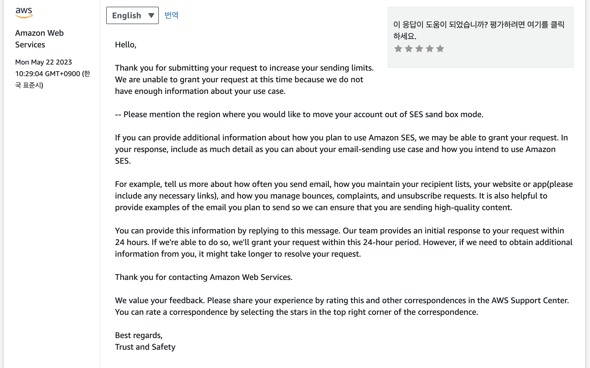 영어로 aws SES를 써야하는 이유, 그리고 관리를 어떻게 할 것인지 추가로 정보를 보내달라는 요청이 왔다.