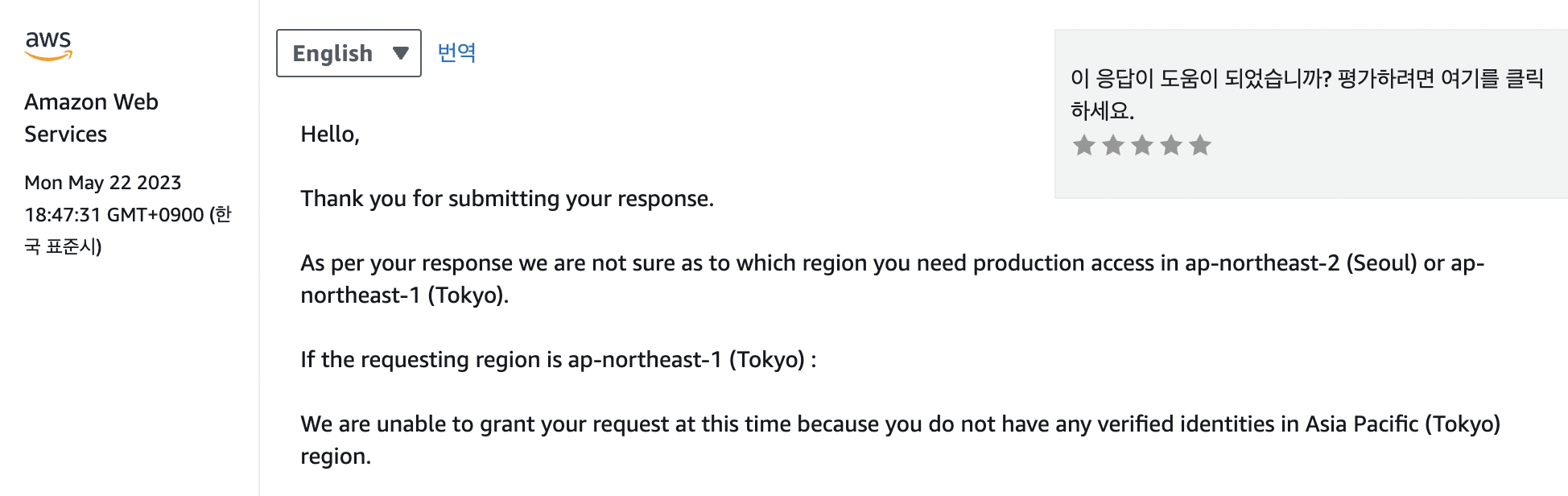 그리고 Sandbox 계정 탈출을 희망하는 region이 애매하다는 판단을 내렸는지, 원하는 region을 보내라고 연락이 왔다.