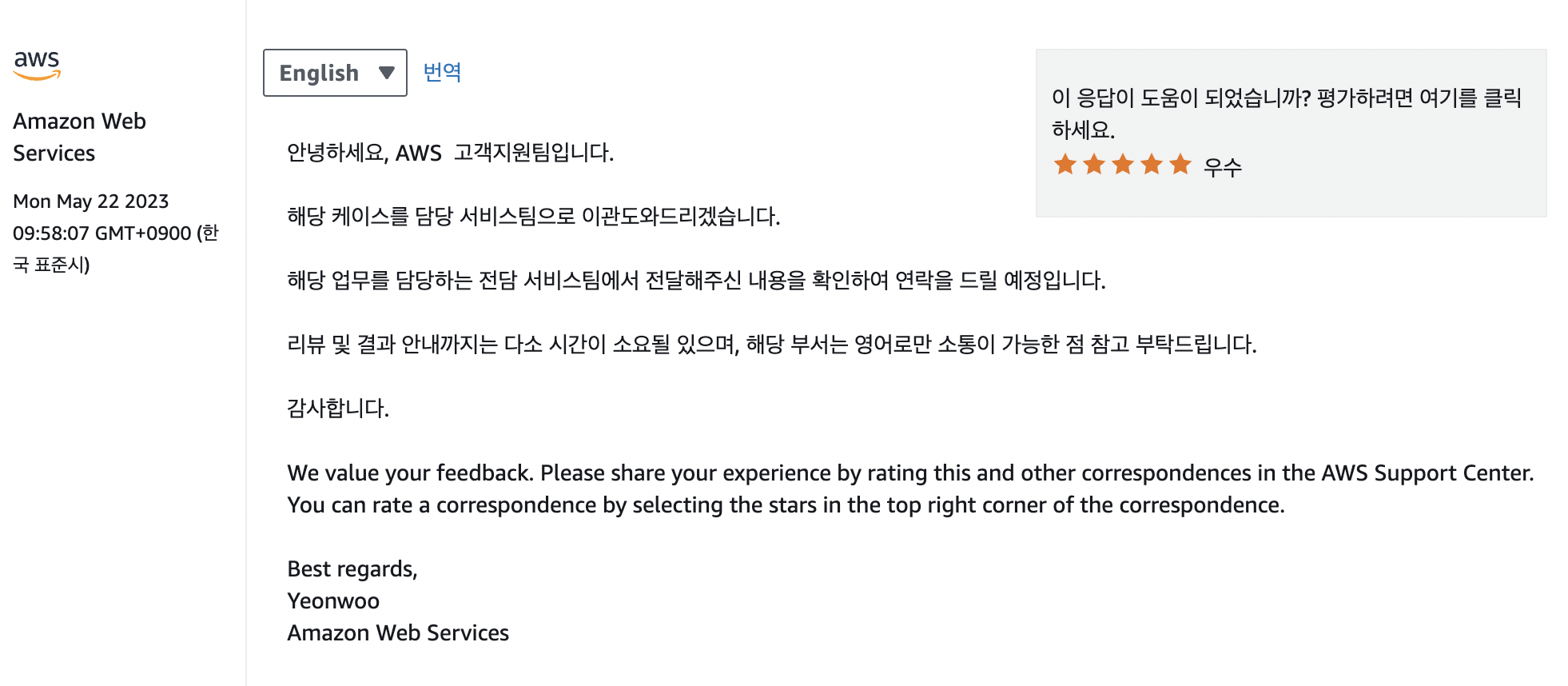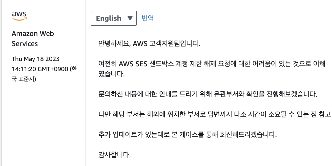AWS SES 담당 부서로 케이스가 이관된다고 한다.