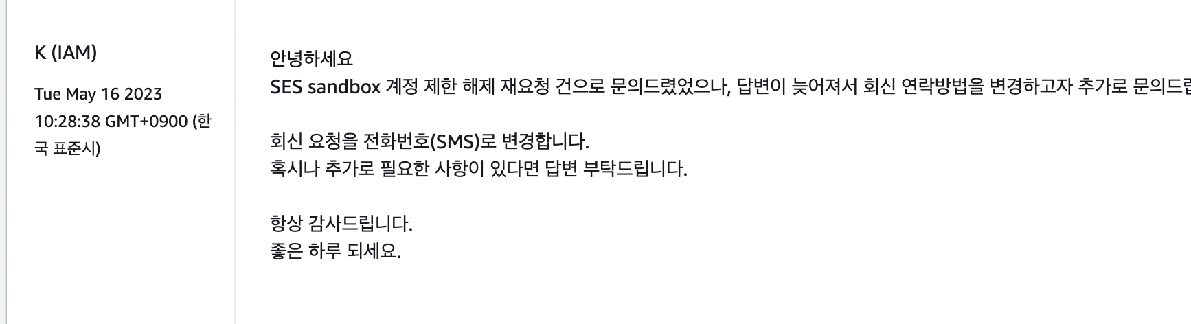 지금 생각하면 SES Sandbox 계정에서 벗어나는 작업을 너무 쉽게 생각했었던 요청을 보냈었는데, 그 내용은 아래와 같다.