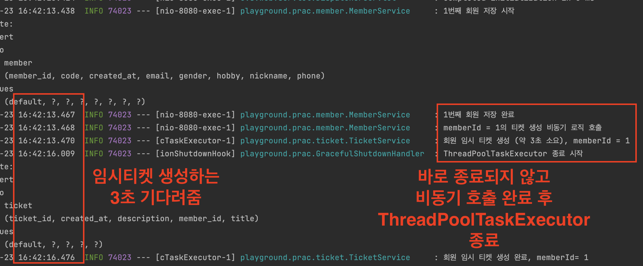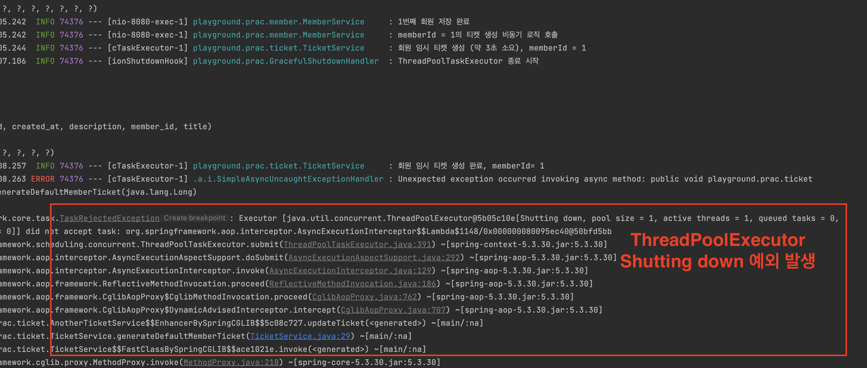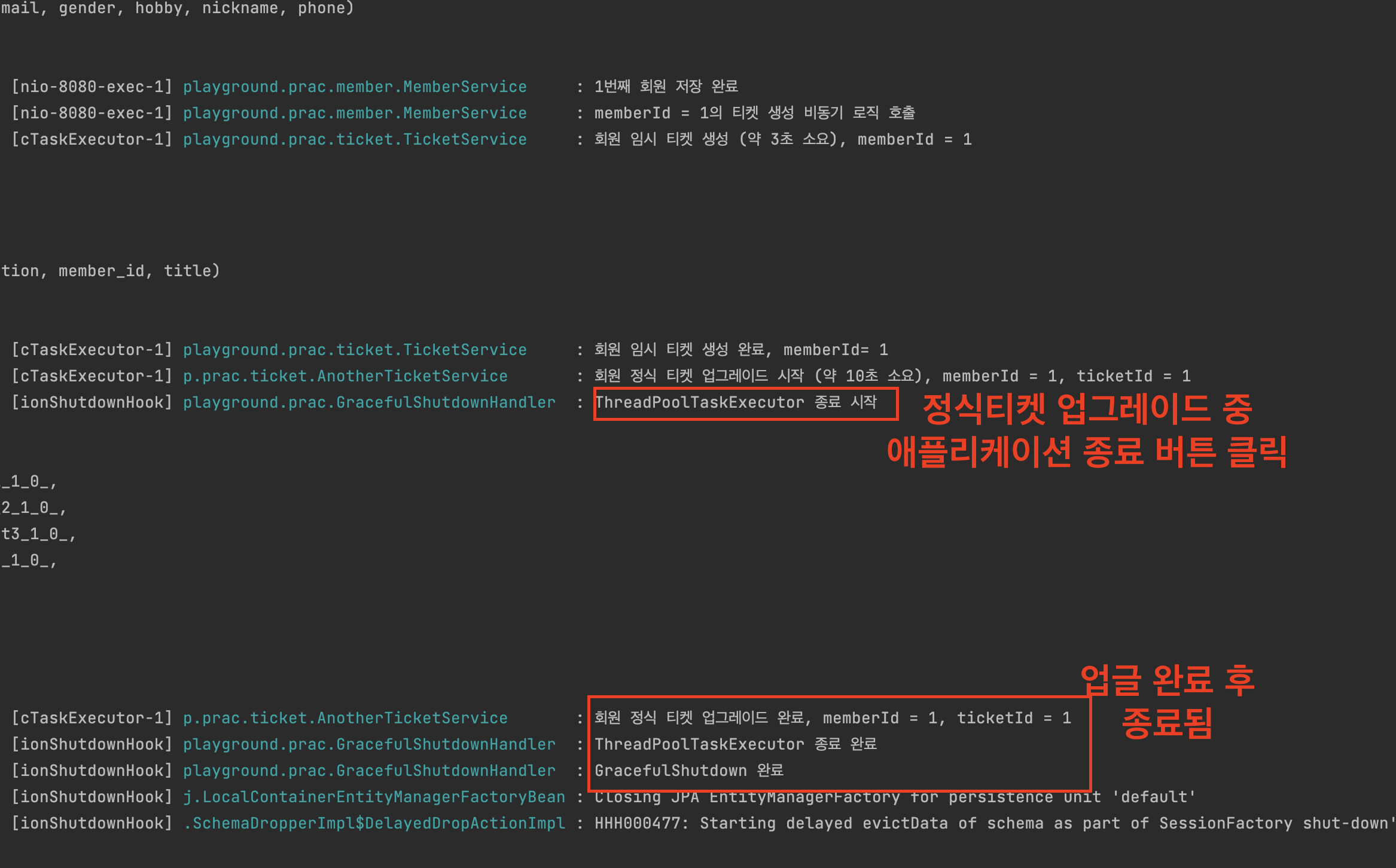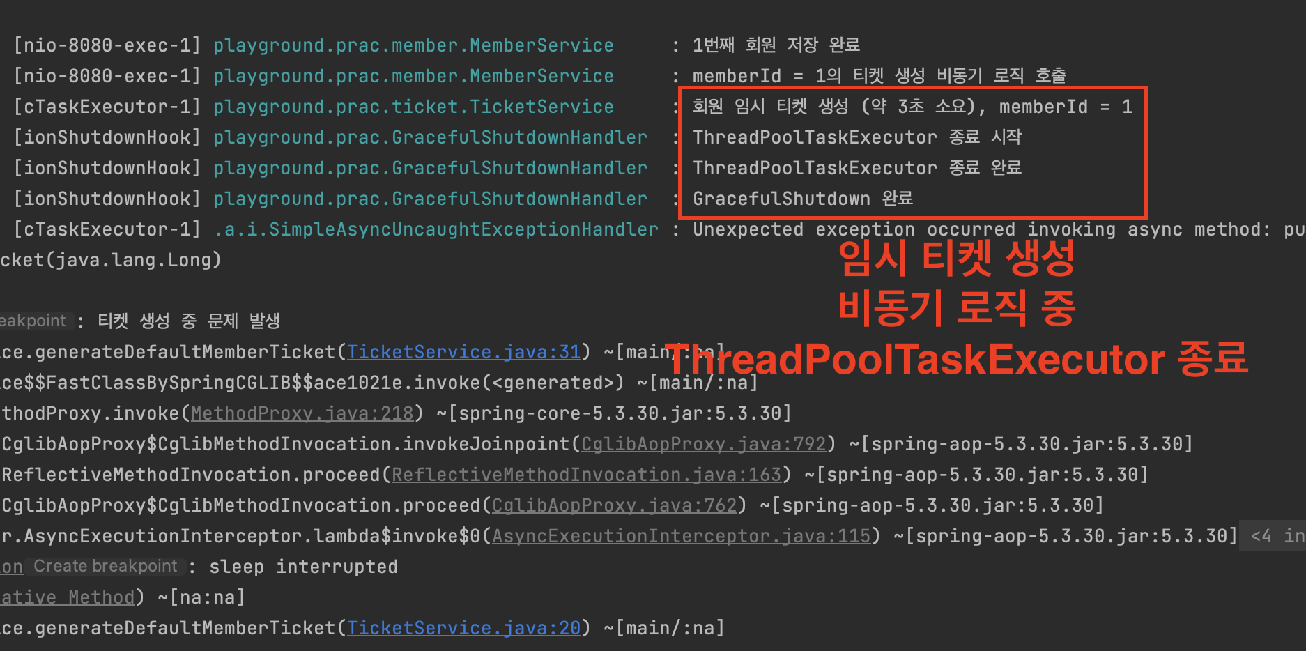 임시티켓 생성까지는 setWaitForTasksToCompleteOnShutdown 옵션이 true이므로 문제 없이 작동됐다.