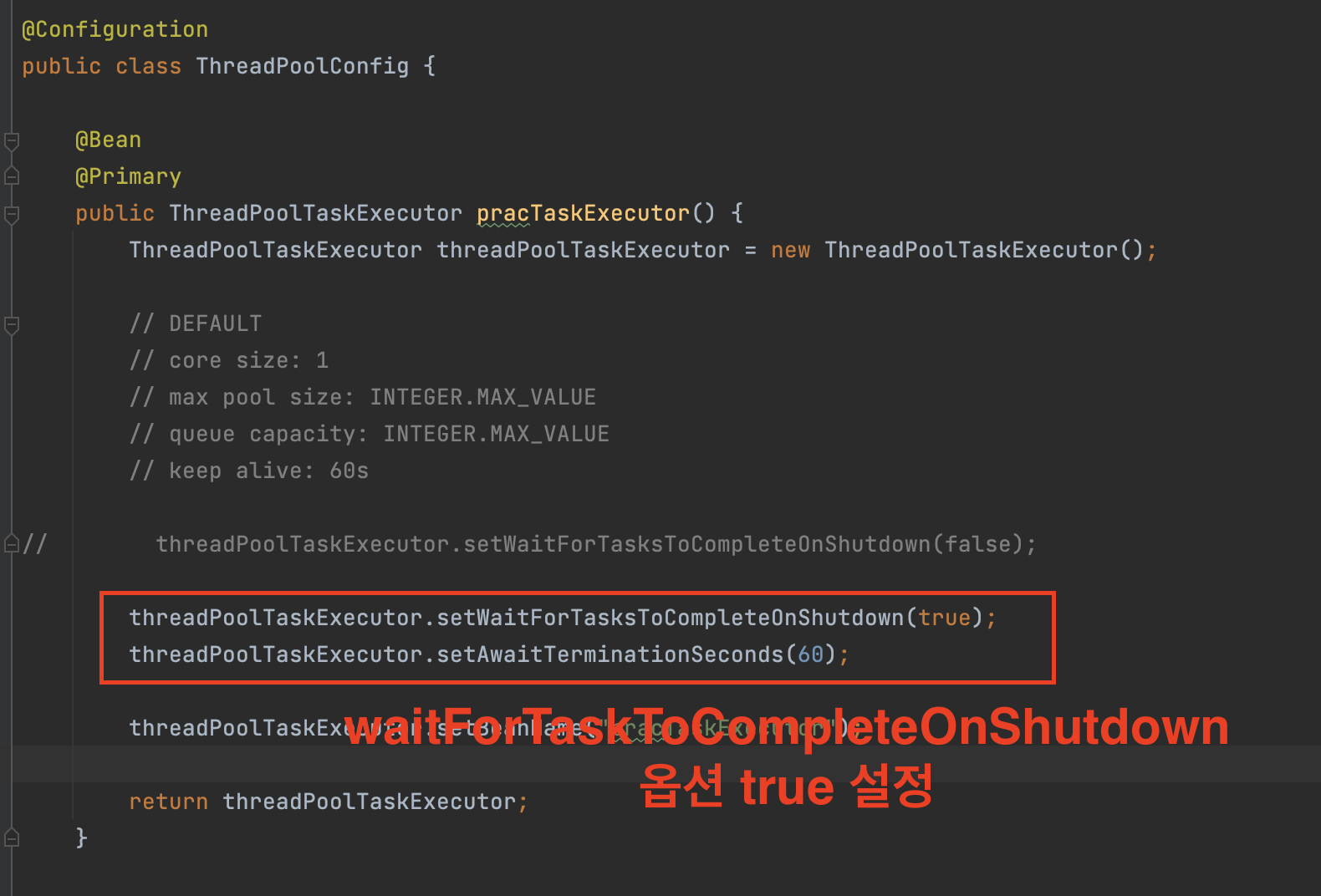 위에서 언급한 setWaitForTasksToCompleteOnShutdown 값을 살펴볼 것이다.