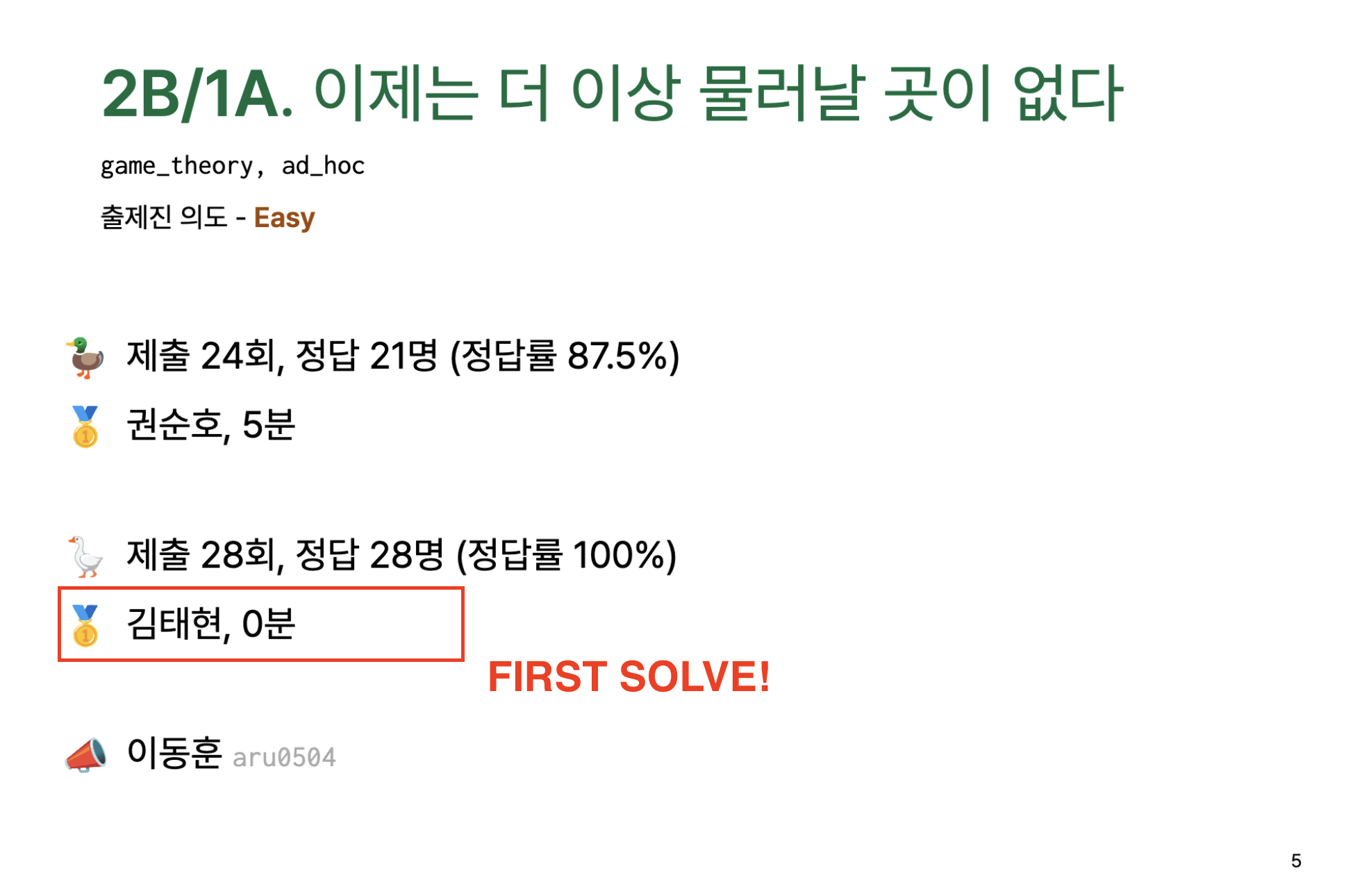 1번 틀릴 때마다 패널티가 좀 크기 때문에, 그리고 수상권이 목적이 아니었기 때문에 천천히 정확하게 푸는 것을 목표로 했다.