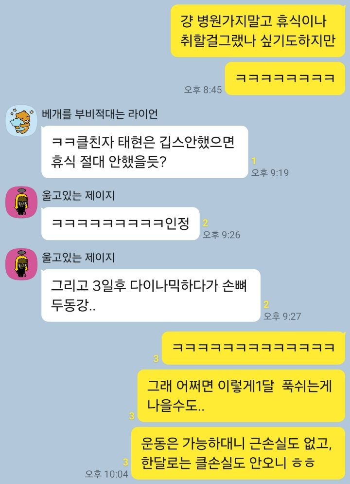 저 위에 조금 얄미워보이는 베개를 부비적대는 라이언이 말하는 것처럼, 지금 깁스 안했으면 상태 좀 이상해도 `응 참을만해~`하고 클라이밍 계속 했을 거 같다. 그러다가 저 제이지 말처럼 나중에 더 크게 다치고 후회할수도 있다 ㅋㅋ