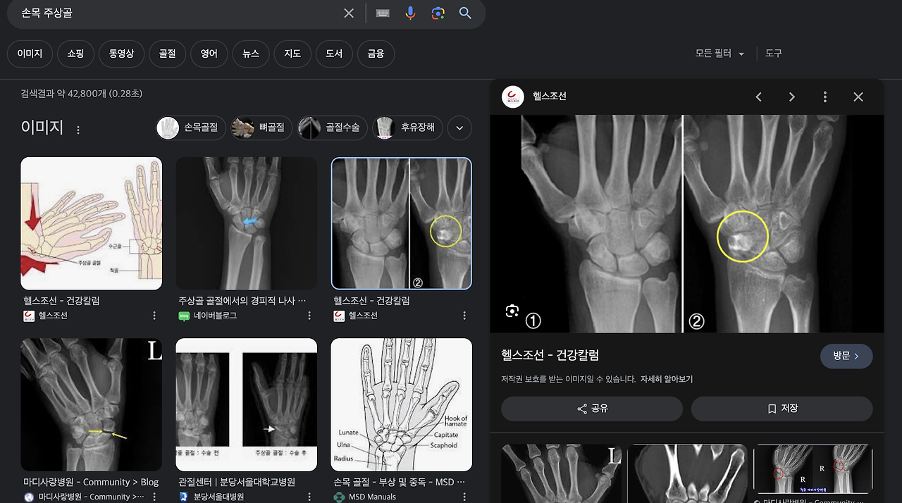 왼쪽 손목과 다르게, 오른쪽 손목 ct 사진에는 주상골 쪽에 두 개의 금이 명확하게 나있었다.