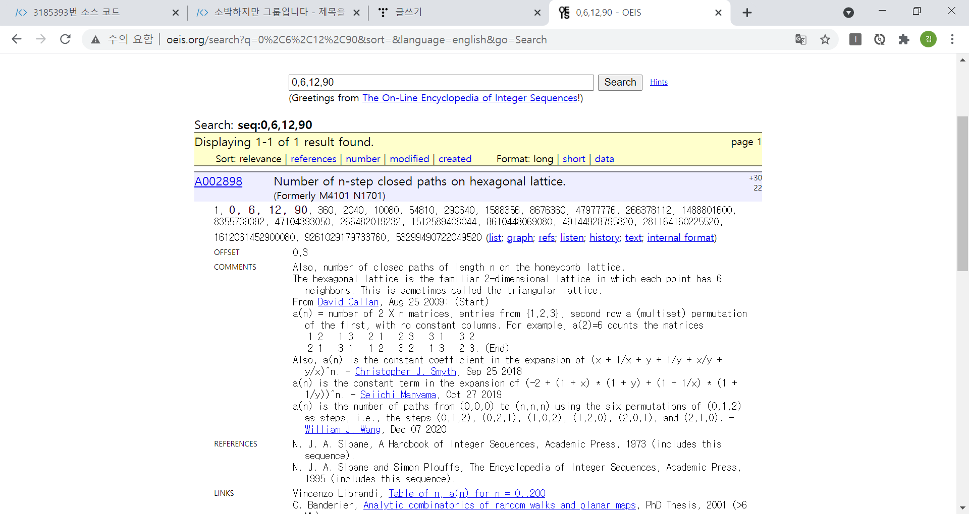 코딩테스트 및 대회에서 구글링 허용이 되는 점을 고려하여 oeis.org에 수열을 돌렸다.