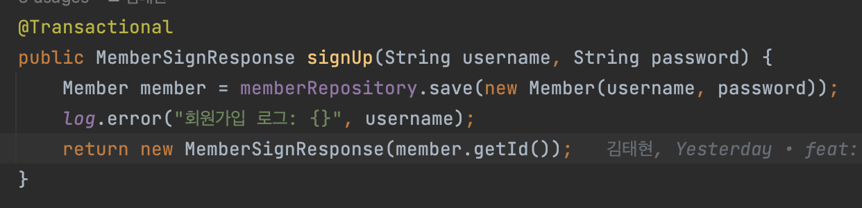 회원가입 (signUp 메서드)을 진행하면 아래 코드와 같이 log.info 로 회원가입 로그를 찍는다.
