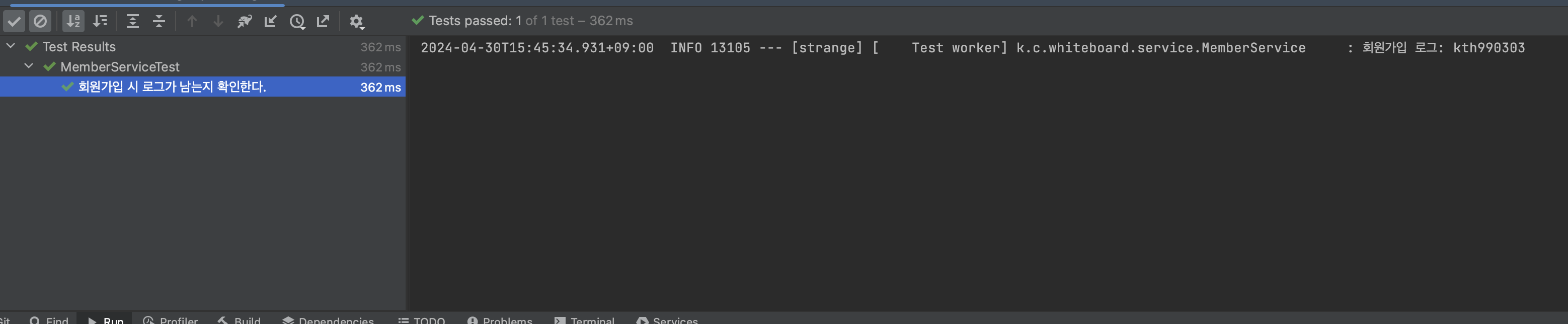 위와 같이 테스트 코드를 작성하여, JUnit 문법으로 로그가 남는지 확인한다.