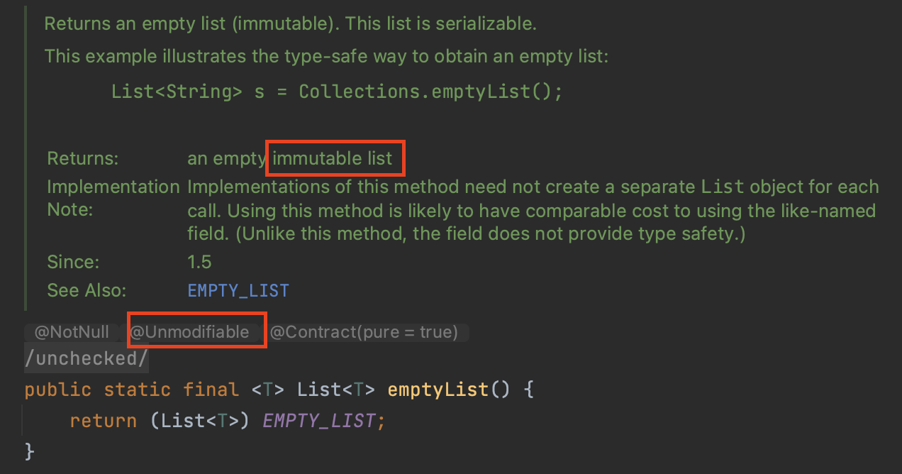 공식문서를 살펴보면 Collections.emptyList 에 대해 아래와 같이 설명이 되어있다.