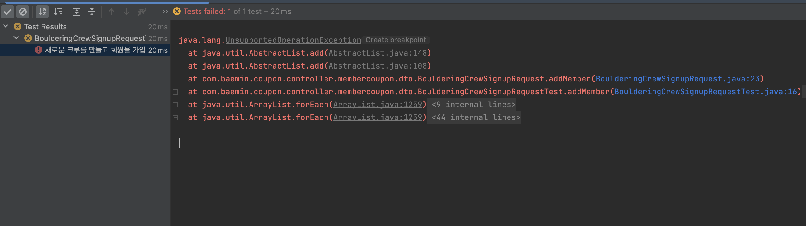 new ArrayList<>(); 로 만들어주거나, Arrays.asList() 를 사용했다면 위와 같은 문제는 발생하지 않았을 것.